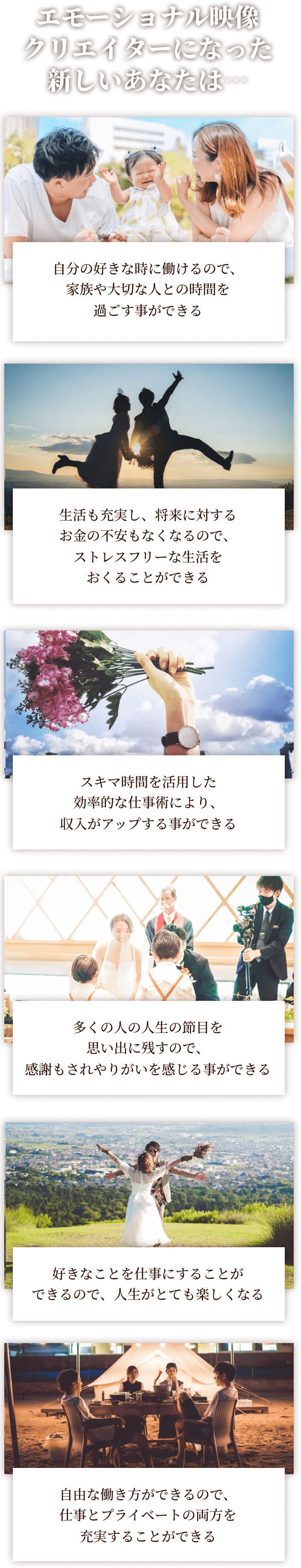 年齢や性別などは一切関係なくエモーショナル映像クリエイターとして働くことが可能です。また、会社員や主婦の方でも1日1時間以上お時間を作れる方であれば行うことが可能になります。