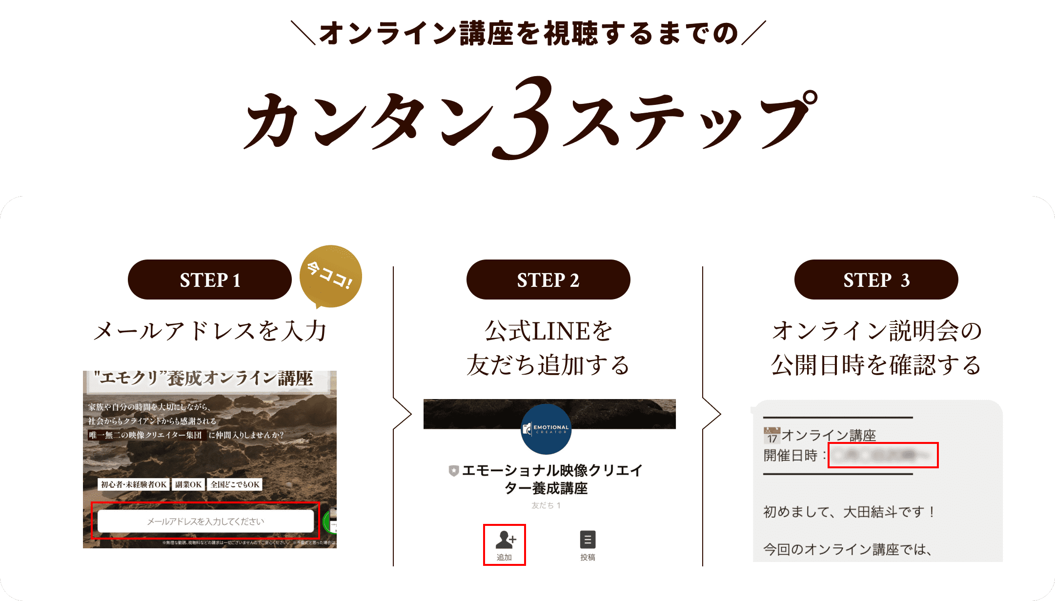 エモーショナル映像クリエイター 養成オンライン講座は完全オンラインにて行います。ページ内の緑色のボタンをクリックし、プログラム専用の公式LINEを登録することで受講できますので是非ご参加ください。