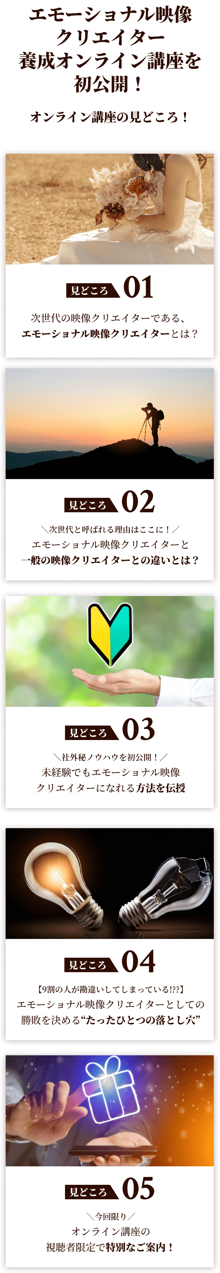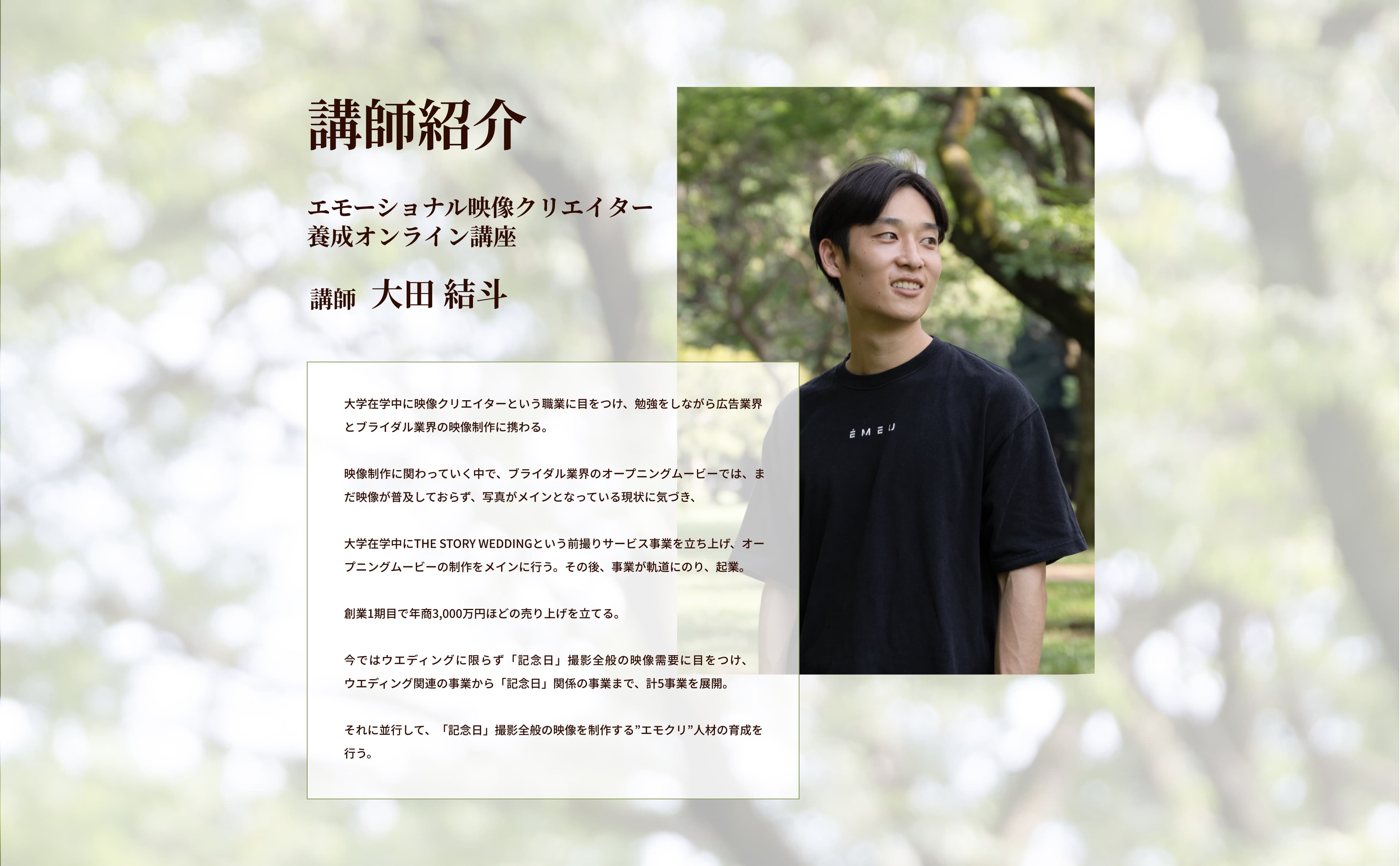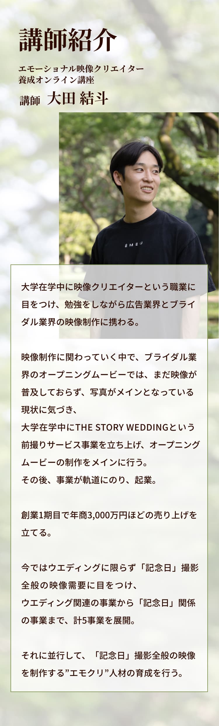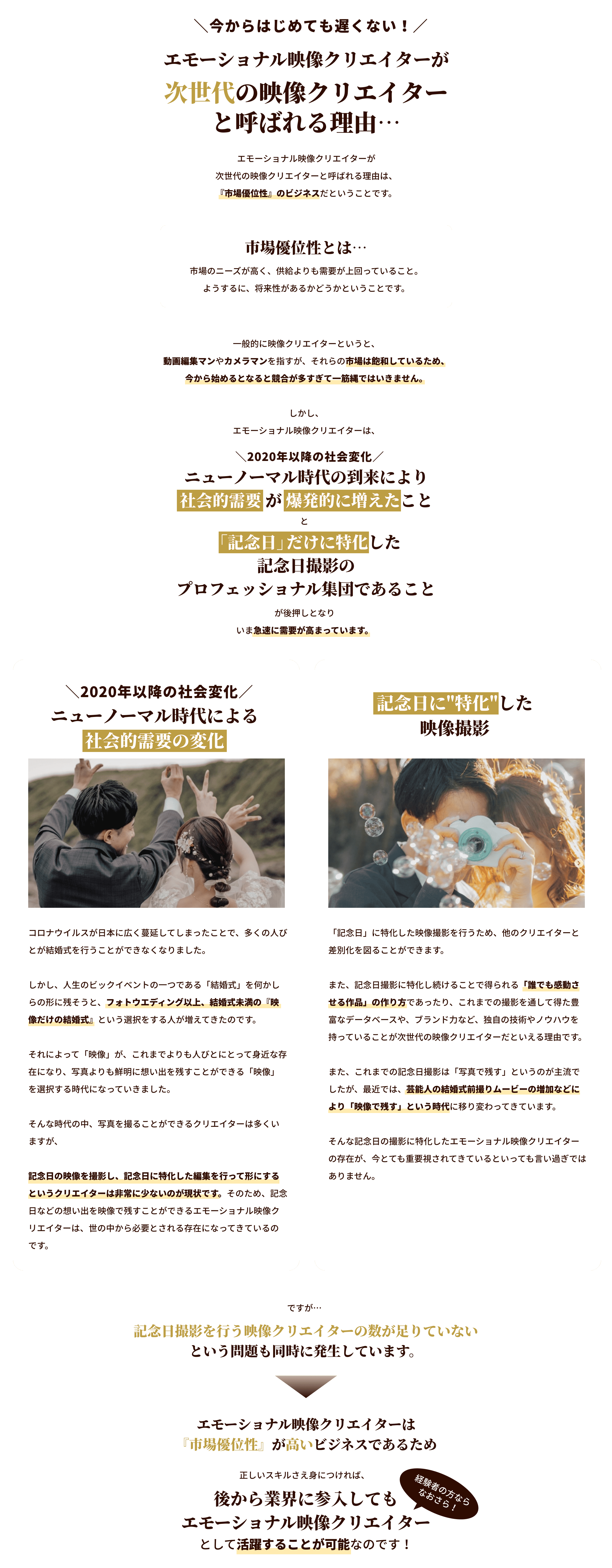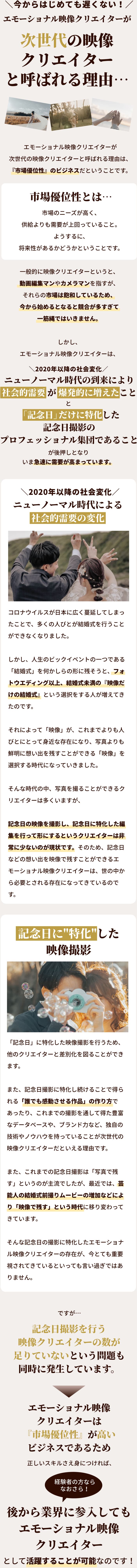 また、結婚式の他にも、「ニューボーン」「マタニティ」「七五三」「成人式」「誕生日」など、『記念日』全体でもエモーショナル映像クリエイターの仕事は増えつつあり、これからも市場が拡大していくと予想されています。