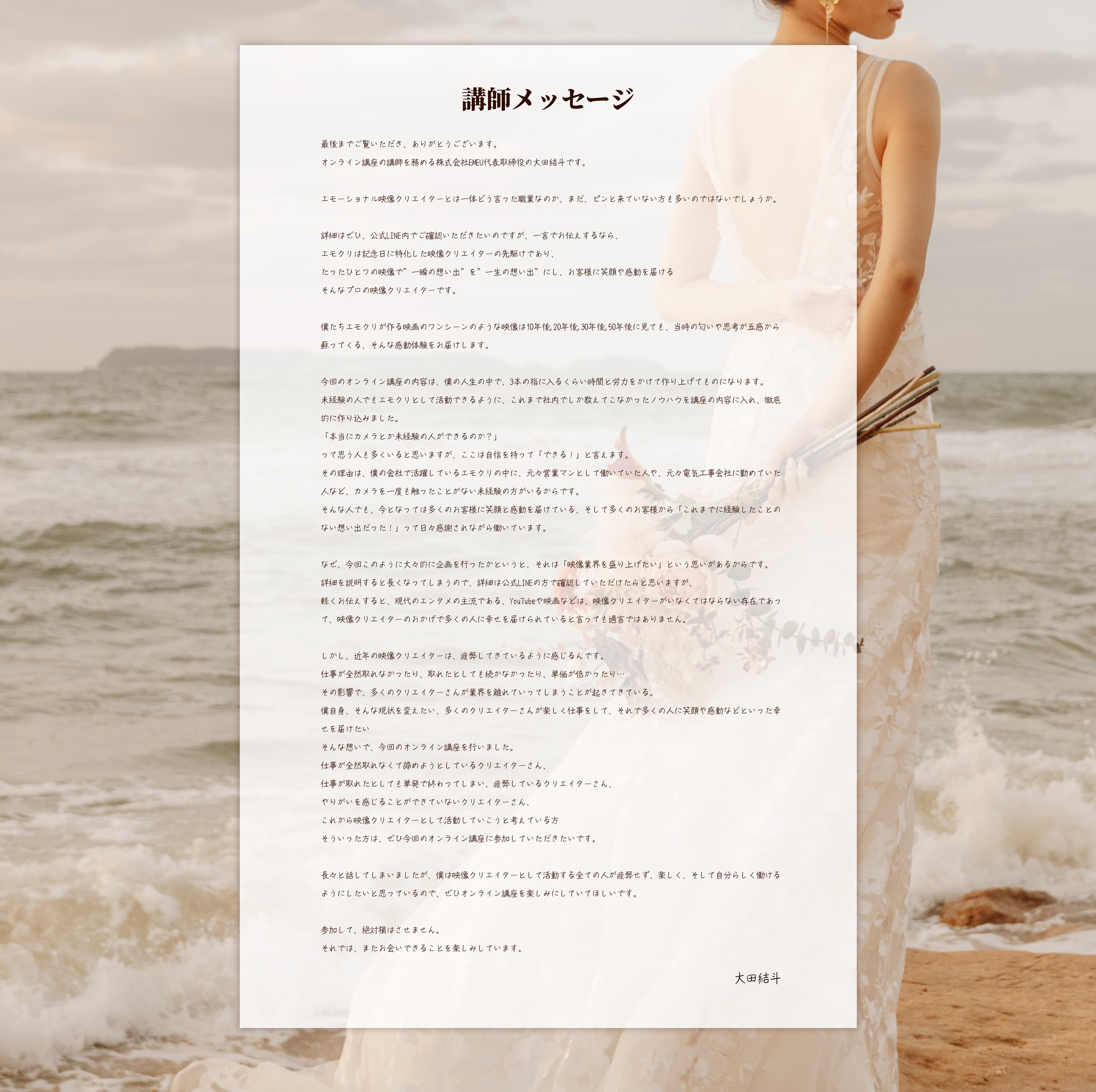 エモクリの撮影は、企業様の撮影とは異なり、お客様と共に作り上げていくことが何よりも楽しくて、いい作品を届けることができると、お客様から熱いメッセージをいただけたり、幸せそうな表情を見ることができるので、他では味わうことのできないとてもやりがいのある仕事だなって思います!