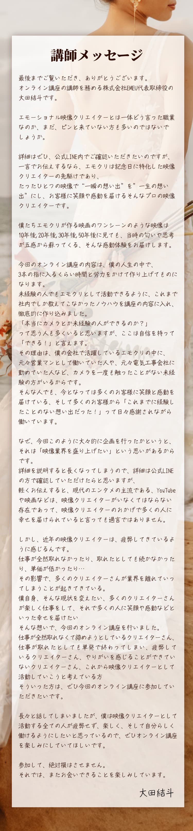 はい、動画編集のスキルや撮影スキル等がなくても大丈夫です。これまでエモーショナル映像クリエイターになった方々もほとんどの方は全くの未経験から取り組んでいます。プログラムの中でもお伝えしていますので、ぜひ最後まで当プログラムを受講ください。
