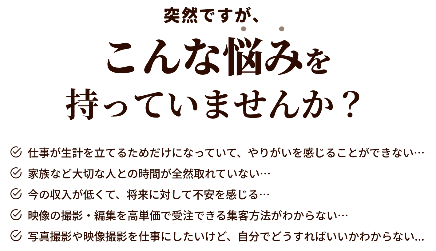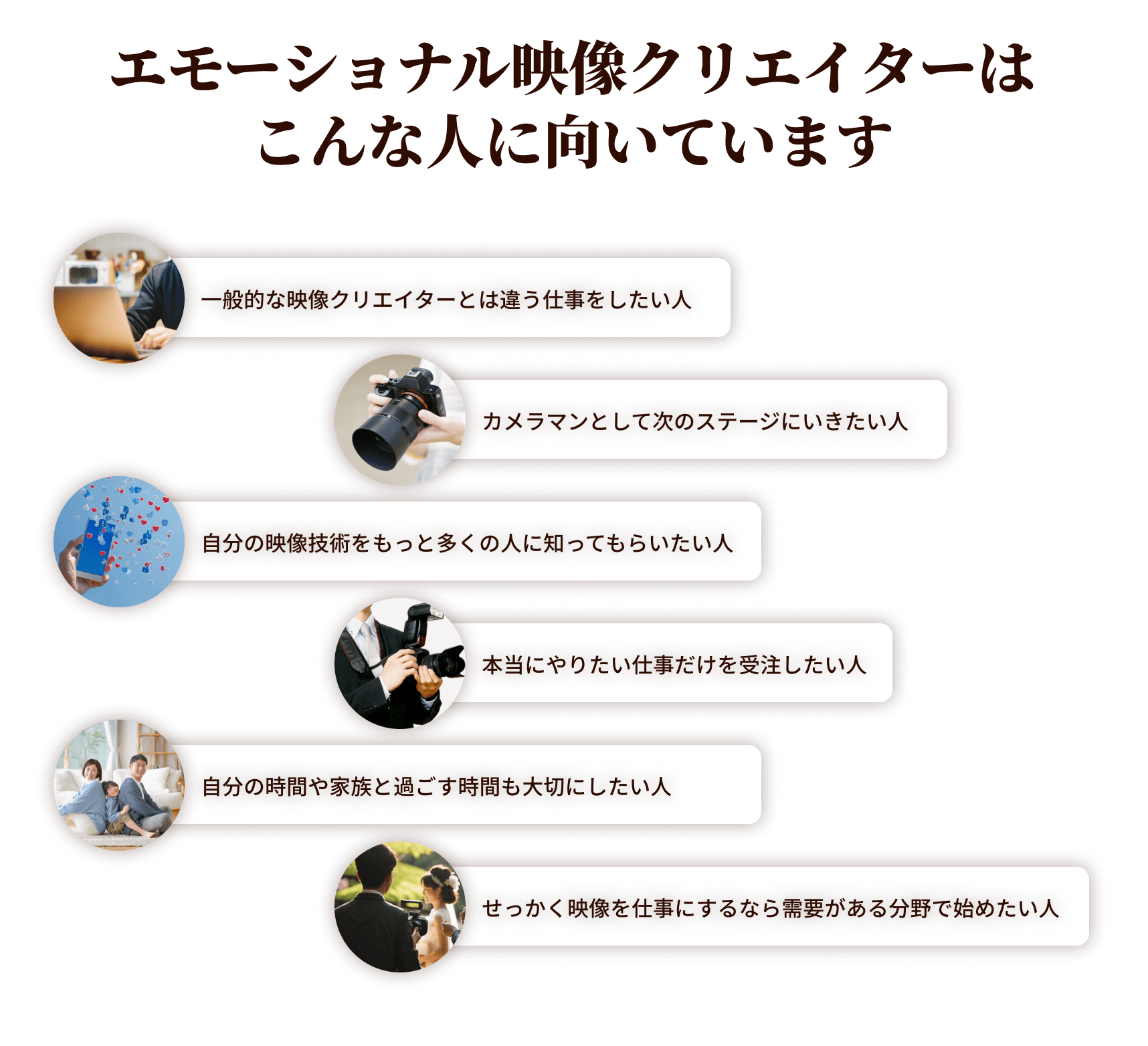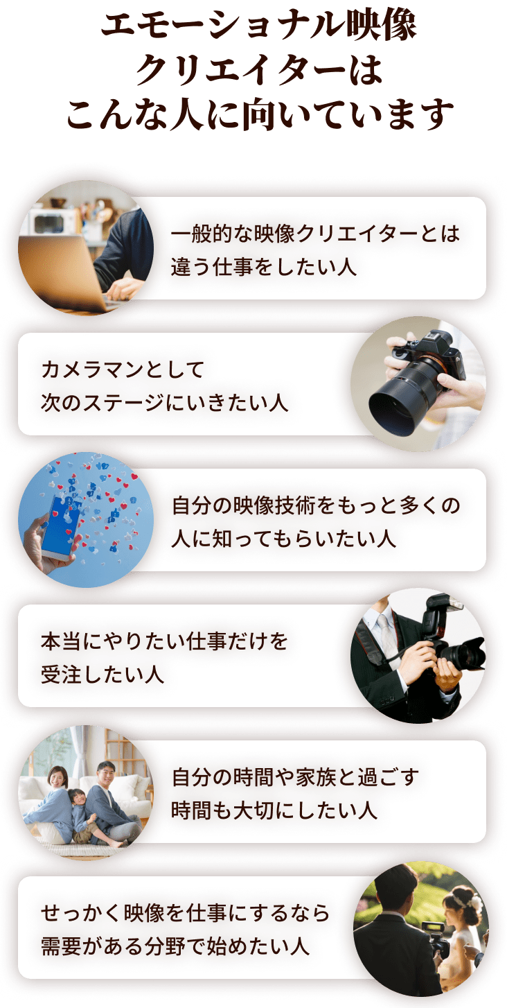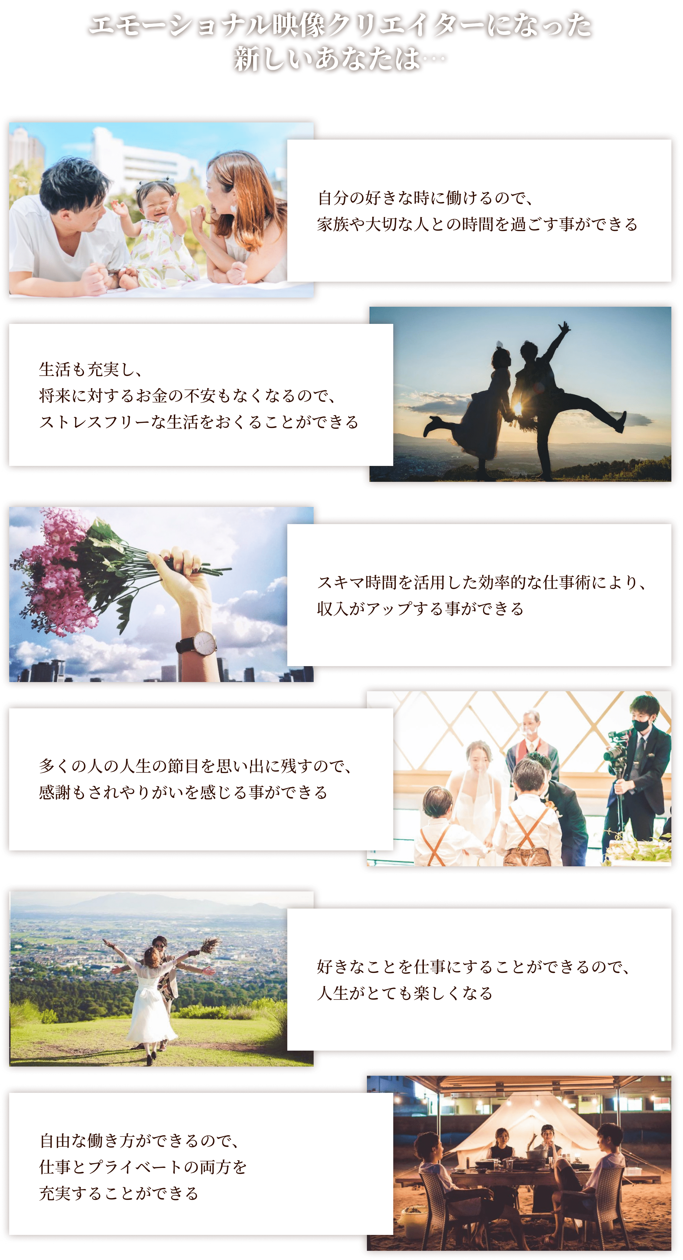 エモーショナル映像クリエイターは、一般の映像クリエイターとは違い、個人で仕事の依頼を受け、撮影から編集まで一貫して行います。なので、仲介手数料などを取られることもなく、仕事の報酬を多く受け取ることができます。